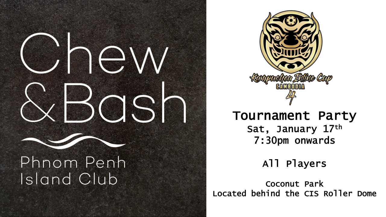The Chew & Bash Phnom Penh Island Club will be the site for the Kampuchea Inline Cup 4 Party beginning right after the Gold Medal game for Division 1 on Sat, Jan 17.